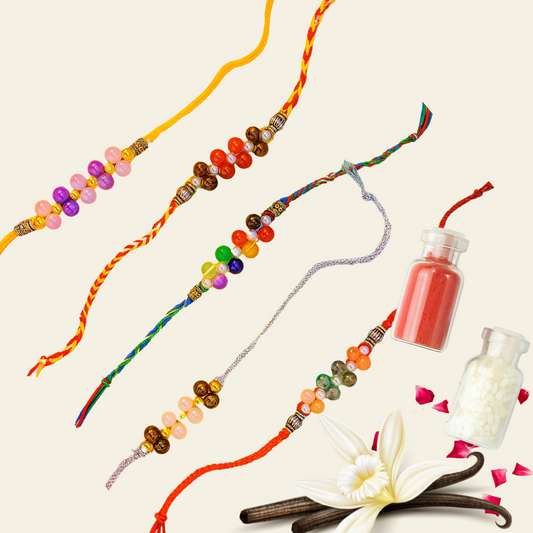 Devaāra - Combo Pack of 5 Rakhi's -Love & Harmony + Heart of Gold + Focus & Success + 7-Chakra + Courage & Confidence
